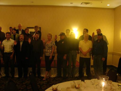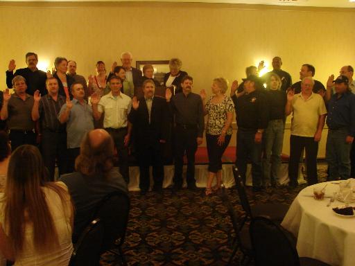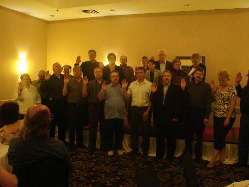 The new officers of the MPWU for the 2008 - 2010 Executive Board were sworn in. The following officers were elected: President - Gary VanHoogstraten; Executive Secretary - Harold Juhl; Secretary-Treasurer - Darren Joyce; Editor - Michael Long; Director of Research and Education - Michael McCain; Legislative Director - John Marcotte; Human Resources/Injury Compensation Director - Jennifer Amos; Veterans Director - John Smeekens; Clerk Craft Director - Richard Blake; Maintenance Craft Director - Larry Miller; MVS Craft Director - Joseph Wrobel; Area 1 Director - Larry Moyer; Area 2 Director - Keith Fletcher; Area 3 Director - Vacant; Area 4 Director - Laura Bullock; Area 5 Director - JoAnna Atkinson; Area 6 Director - Mary Stephenson; Area 7 Director - Thomas Lothamer; Area 8 Director - Russ Nicoson; Area 9 Director - Amy Puhalski; Area 10 Director - Ron Krumrie; Area 11 Director - Mike Wekwert; Area 12 Director - Dennis Barber. Also sworn in was the Retirees Chapter officers, MPWU Auxiliary Officers, and POWER Representative.